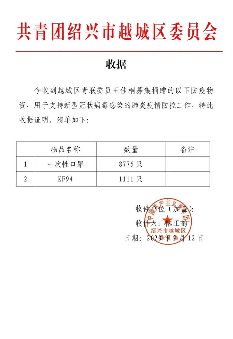 现在这批物资已经陆续到达绍兴市越城区人民政府,王佳桐没有特别多的话,只是说:我做了一件力所能及的小事,重要的是,我们所有人一起,共度这场难关,等待花开!