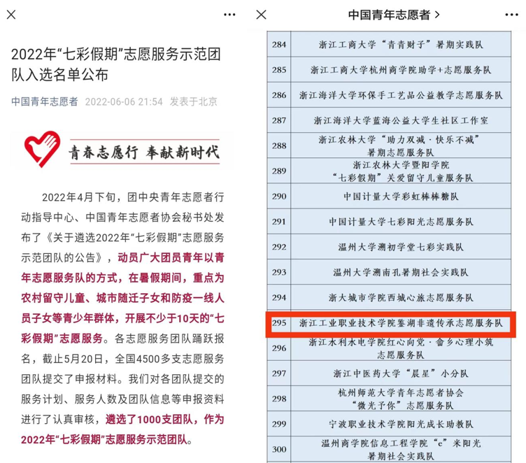 近日,团中央青年志愿者行动指导中心、中国青年志愿者协会秘书处联合公布2022“七彩假期”志愿服务示范团队入选名单。我校鉴湖非遗传承志愿服务队在全国4500多支志愿服务团队中脱颖而出,成功入选2022"七彩假期"志愿服务示范团队。