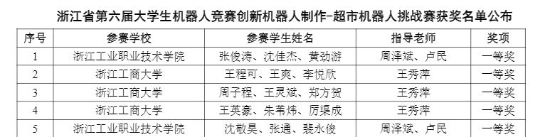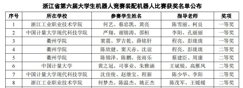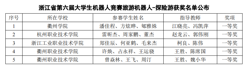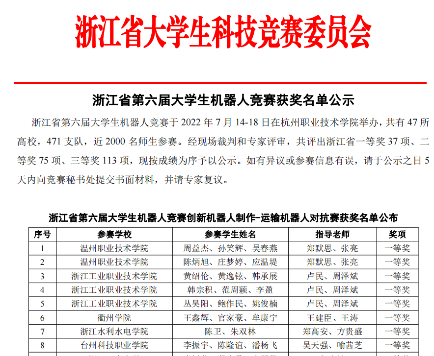 日前,2022年浙江省第六届大学生机器人竞赛在杭州职业技术学院落下帷幕,共有47 所高校,471 支队,近 2000 名师生参赛。经现场裁判和专家评审,共评出浙江省一等奖37项、二等奖75项、三等奖113项。我校师生共获得一等奖7项(含2个项目冠军)、二等奖5项、三等奖4项。一等奖数量、冠军数量在所有参赛高校中排名第一。