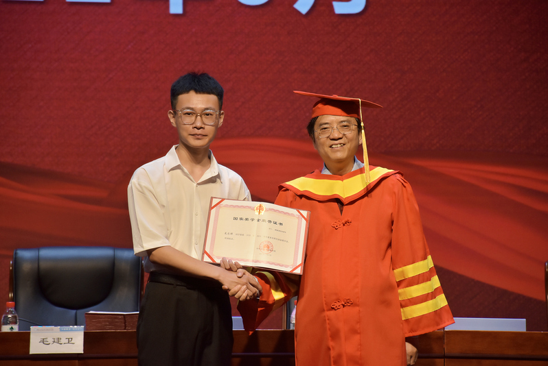 毕业典礼同步云端直播,在庄严的国歌声中拉开序幕,潘荣江宣读了2022届毕业生文件及国家奖学金、省级优秀毕业生名单。党委副书记、校长毛建卫为毕业生代表和国家奖学金获得者颁发了毕业证书与荣誉证书。主席台其他领导为省级优秀毕业生颁发了荣誉证书。