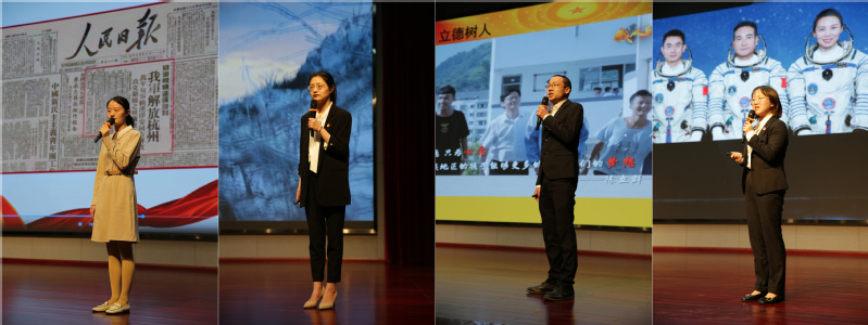 机电工程学院党总支袁文琪解读油画《浙江解放》,透过一只千疮百孔的搪瓷杯,见证艰苦的历程,照亮未来的征程;交通学院党总支韩超男讲述歌曲《天地我来过》,带领听众走进长津湖阵地,从奋不顾身的先烈身上汲取新时代的奋进力量;鉴湖学院党总支张毅讲述教育工作者在教书育人、抗击疫情中的智慧与坚韧,让教师的初心、担当与创新更加鲜活;团委直属党支部黄慧将自身的努力融入祖国航天事业的时间表中,在星辰大海的征途上,小我大我紧密相融、奋斗精神共振交响;设计与艺术学院党总支冯颖瑜讲述美术作品《红岩》,剖析作品的技艺手法、历史意义、革命精神,书写心中的热血与爱国的情怀;公共基础教学部党总支王章伟将革命老歌《团结就是力量》用崭新的形式,呈现团结的民族传统、团结的革命斗争和团结的远大未来;建筑工程学院党总支夏乙溧讲述歌曲《祖国不会忘记》,缅怀牺牲的烈士、致敬奉献的楷模;机电工程学院党总支季超讲述“两弹一星”前辈干惊天动地的事、做隐姓埋名的人,谱写出新时代的青春奋斗之歌;设计与艺术学院党总支吉书红用自身的经历,详述了新中国脱贫攻坚和解决留守儿童问题的奋斗史,在振兴之路上奏响幸福之声;党院办直属党支部章梦云回顾档案工作经历,透过厚重资料所记录的校史,诠释新时代的奋斗精神;科技质管联合直属党支部席钦辰重温《银河补习班》中平凡孩子的成才历程,分享学生们对未来的畅想,阐释为梦想而奋斗所带来的幸福;财经学院党总支李庆兰讲述电影《夺冠》,以小人物故事映射祖国大时代温情,致敬奔竞不息、永立潮头的时代精神;交通学院党总支黄晟讲述了牺牲的驻村第一书记黄文秀的最美韶华,彰显出不畏路遥、不惧道险的坚定信仰;商贸学院党总支马健业唱诵《我和我的父辈》中的绝笔诗,缅怀党史中如星辰般闪耀的英雄,书写新时代青年为祖国接续奋斗的篇章。