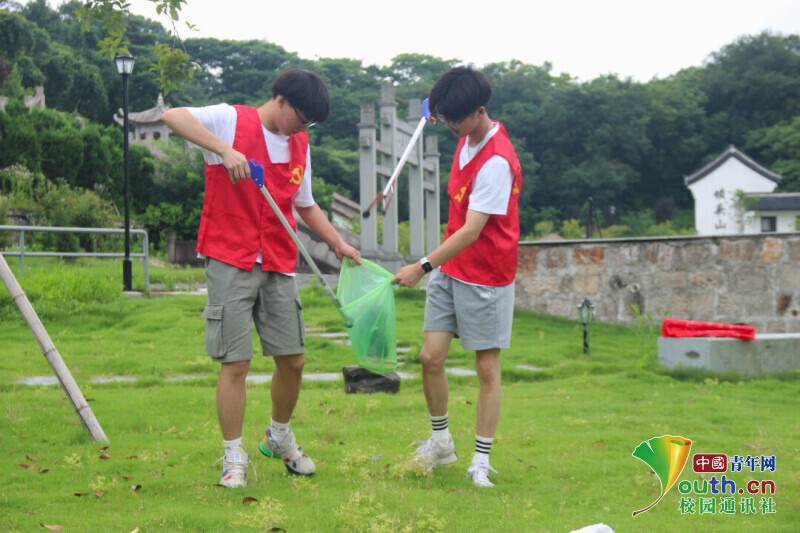 图为实践小队在进行“巡河”环保活动,清理草地垃圾。