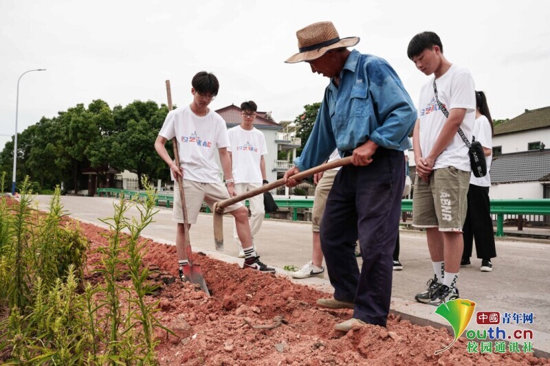 图为实践团队向当地农民学习如何锄地。中国青年网通讯员 孔万波 摄