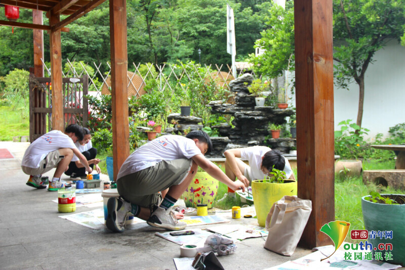 图为实践团队在当地农家小院中对盆栽进行创作绘画。